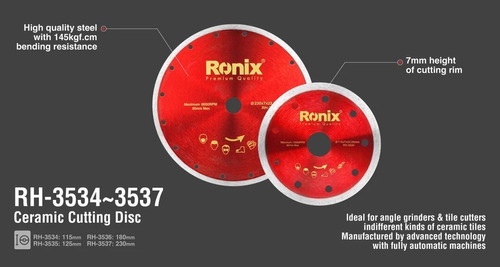 O RH-3537 assim como os demais discos de corte para granito Ronix, acima citados, possui diâmetro do rebolo 230mm, mandril 22,2mm, segmento 7mm, pode ser aplicado para corte de granitos e mármores.