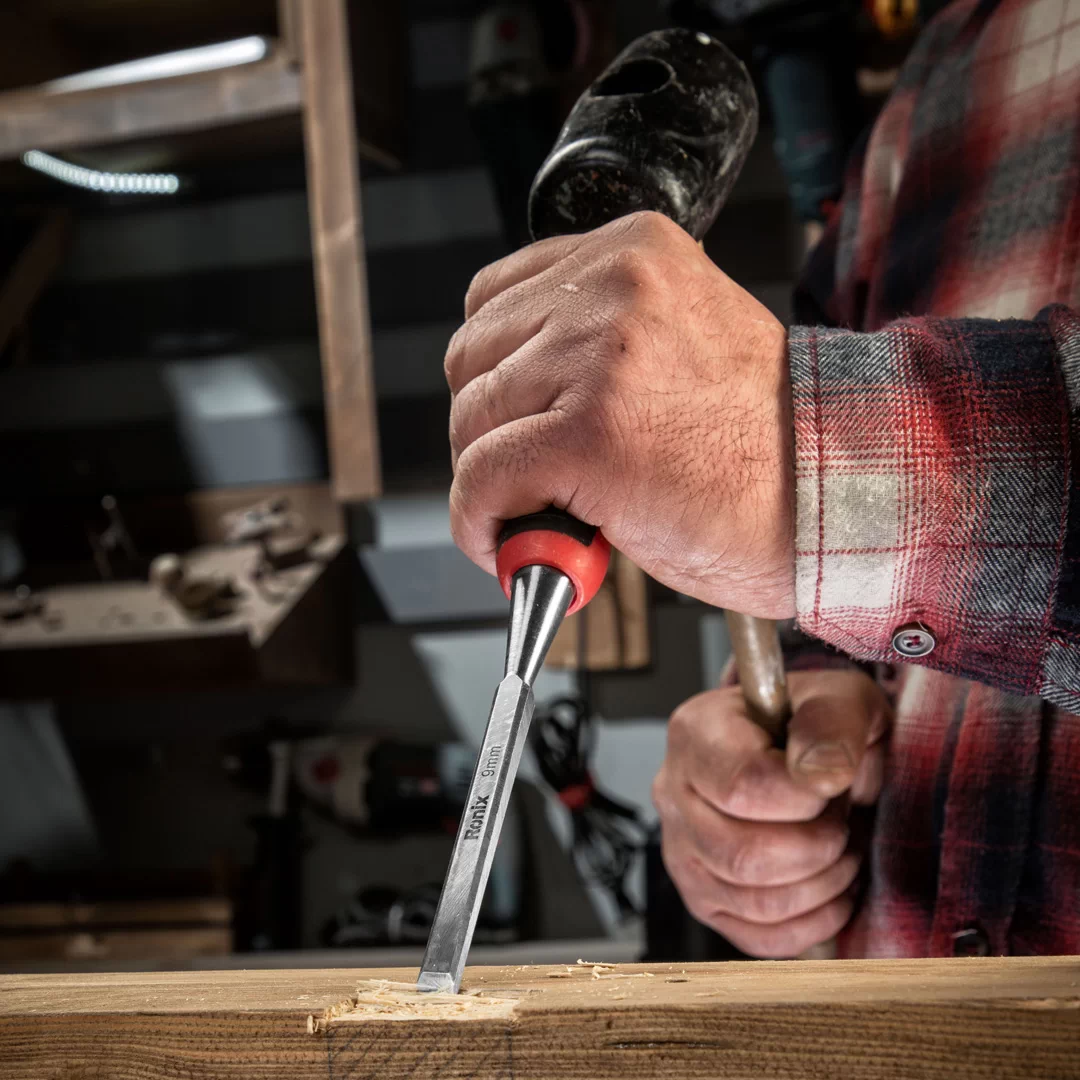 Os formões de madeira Ronix possuem uma estrutura de topo de aço que os torna resistentes a golpes de marretas e martelos.